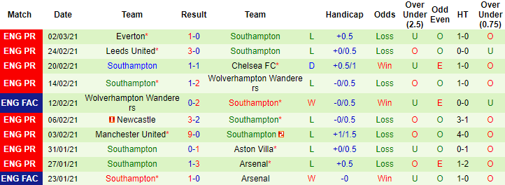 + Thống kê 10 trận gần nhất của Southampton