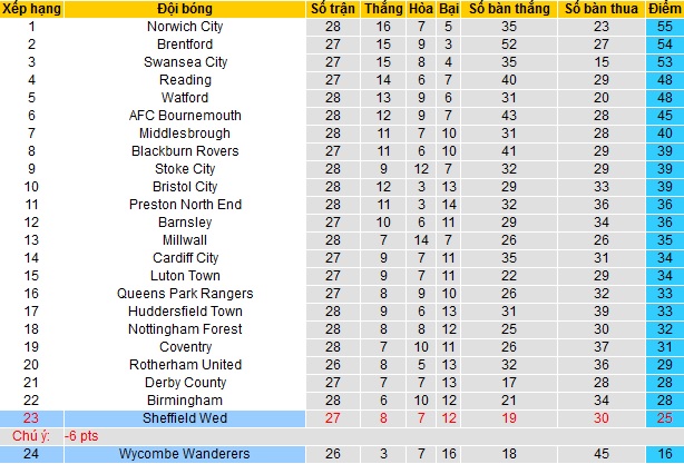 Thế nên hiện tại đội bóng vẫn đang đứng áp chót bảng xếp hạng của giải hạng nhất Anh với 25 điểm sau 27 vòng đấu. Tuy nhiên khoảng cách của đội bóng với nhóm các đội trụ hạng giờ chỉ còn là 3 điểm, và nếu không bị trừ điểm thì lúc này Sheffield Wednesday đã đứng đâu đó ở vị trí thứ 19-20.