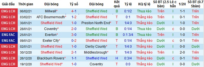 + Thống kê 10 trận gần nhất của Sheffield Wednesday