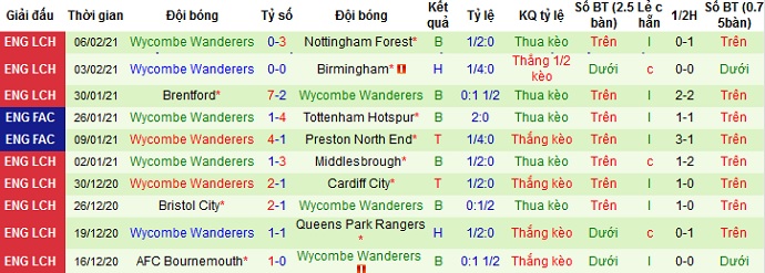 + Thống kê 10 trận gần nhất của Wycombe Wanderers