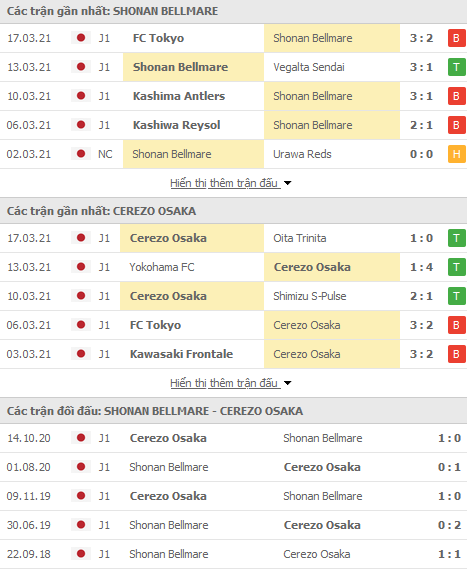 Phong độ và thống kê đối đầu gần đây Shonan Bellmare vs Cerezo Osaka: