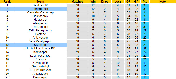Sau 18 lượt trận, đội bóng của HLV E. Bulut thắng 12 trận, hòa 2 và để thua 4 lần. Lúc này, họ tạm thời đứng ở vị trí thứ 2 trên BXH và chỉ kém đội đầu bảng Besiktas đúng hiệu số bàn thắng thua. Đêm nay, Fenerbahce có chuyến hành quân tới sân của Sivasspor và đây sẽ là cơ hội tốt để họ bứt phá trên bảng tổng sắp.