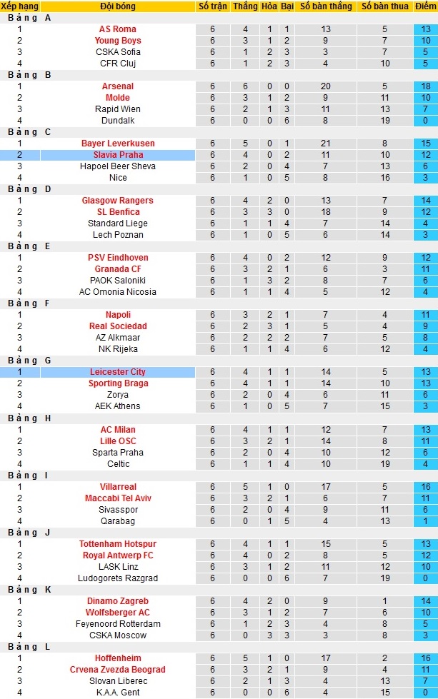 Bảng xếp hạng giai đoạn vòng bảng Europa League