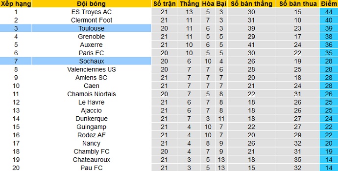 Trận đấu muộn nhất của vòng 21 giải hạng nhì Pháp sẽ là cuộc đọ sức giữa Sochaux và Toulouse. Sau 20 vòng đấu Sochaux đang có được 28 điểm và đứng thứ 7 trên bảng xếp hạng. Tuy nhiên khoảng cách đến đội thứ 5, có suất dự play-off thăng hạng vẫn đang là 8 điểm.