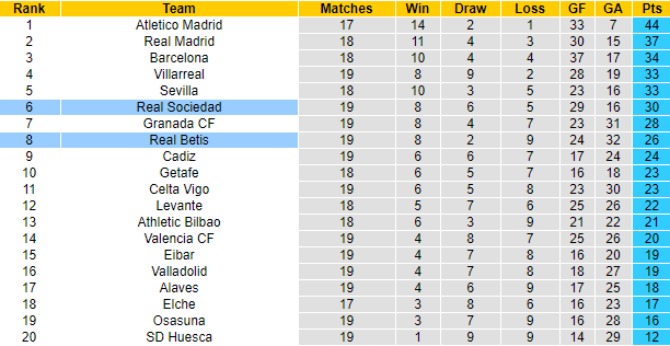 Tay trắng rời cuộc chơi là kết cụ mà Betis thường xuyên phải đón nhận ở các chuyến làm khách trên sân của Sociedad. Trong vòng 6 lần gần đây tiếp đón Betis trên sân nhà tại La Liga, Sociedad batats bại với 5 chiến thắng và 1 trận hòa. Dẫu vậy ở trận đấu sắp tới, Betis lại nhận được nhiều sự tin tưởng vào khả năng có điểm.