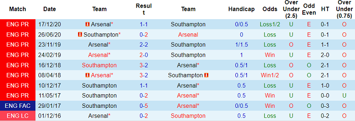Phong độ và thống kê đối đầu Southampton vs Arsenal gần đây