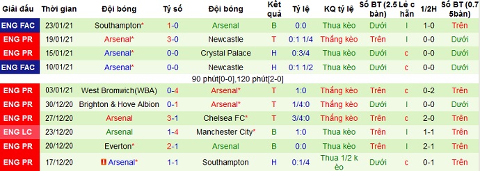 + Thống kê 10 trận gần nhất của Arsenal