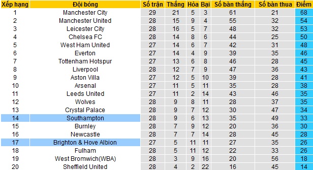 Trong khi đó Brighton đã đứng ngay trên nhóm cầm đèn đỏ ở vị trí thứ 17. Với 26 điểm có được sau 27 vòng đấu, Brighton chỉ đang bằng điểm với đội đứng sau Fulham nhưng xếp trên nhờ hơn về hiệu số bàn thắng, đồng thời đang thi đấu ít hơn 1 trận.