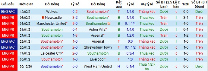 + Thống kê 10 trận gần nhất của Southampton