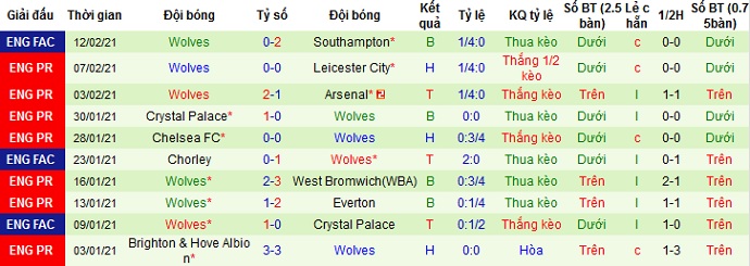 + Thống kê 10 trận gần nhất của Wolves