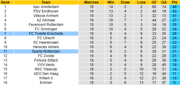 Phía bên đối diện, Twente thi đấu tốt hơn và đang đứng ở vị trí thứ 7. Họ cần giữ vững thứ hạng này để có thể lọt vào giai đoạn play-off tranh suất dự Europa League. Nên nhớ phía sau Twente, Utrecht đã áp sát khi thắng ở trận cầu sớm ngày hôm qua.