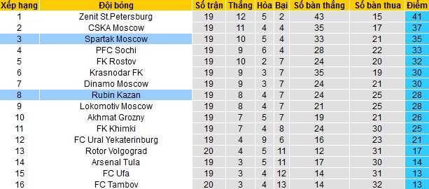 Bảng xếp hạng giải VĐQG Nga trước vòng 20