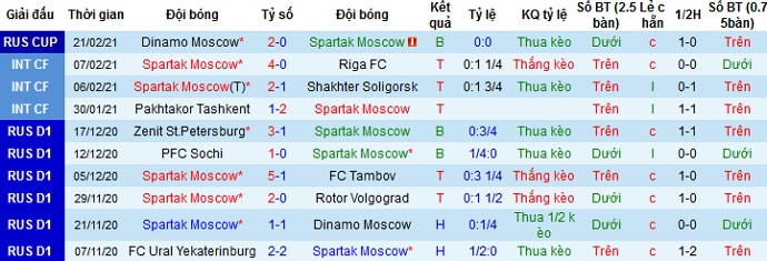 + Thống kê 10 trận gần nhất của Spartak Moscow