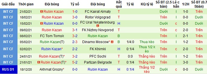+ Thống kê 10 trận gần nhất của Rubin Kazan