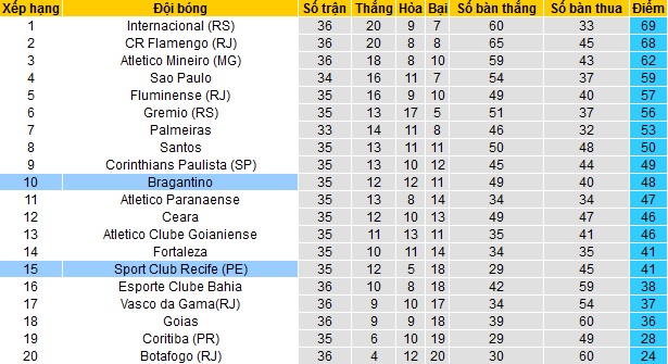 Bảng xếp hạng giải VĐQG Brazil vòng 36