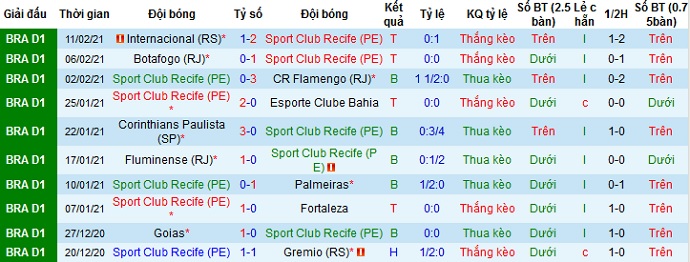 + Thống kê 10 trận gần nhất của Sport Recife