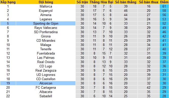 Trong khi đó Alcorcón đã tụt xuống nhóm cầm đèn đỏ và hiện đang xếp ở vị trí thứ 19. Tuy nhiên đội bóng vẫn đang có cùng bằng điểm với đội đứng trên trong nhóm trụ hạng là Castellon, đồng thời cũng chỉ hơn đội bét bảng Sabadell có đúng 2 điểm.