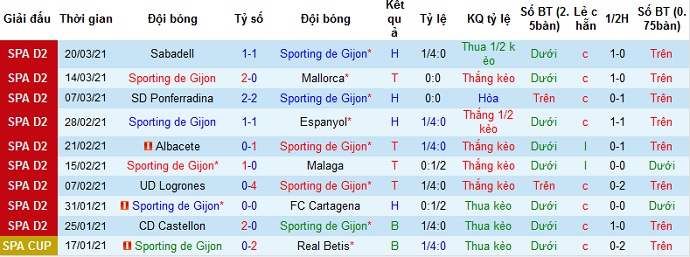 + Thống kê 10 trận gần nhất của Sporting Gijón