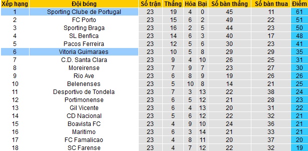 Trong khi đó Guimarães đang đứng ở vị trí thứ 6 của bảng xếp hạng với 35 điểm cũng sau 23 vòng đấu. Mặc dù đứng ngay dưới các đội Top 5, có vé dự cúp châu Âu nhưng Guimarães vẫn đang còn kém tới 6 điểm.