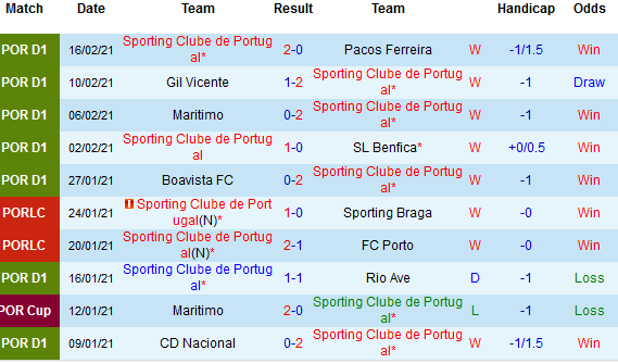 + Thống kê 10 trận gần nhất của Sporting Lisbon