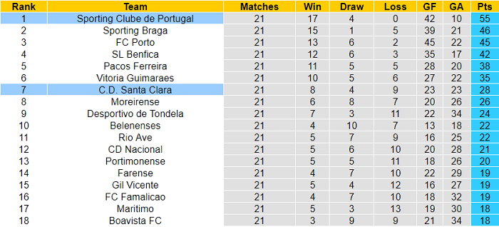 Thứ ba: Sporting Lisbon sở hữu dàn cầu thủ chất lượng hơn và lối chơi gắn kết hơn hẳn so với Santa Clara. Điều này thể hiện rõ qua thành tích của họ. Santa Clara mới có 28 điểm sau 21 vòng đấu, chỉ bằng phân nửa điểm số mà Sporting Lisbon giành được.