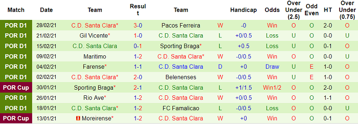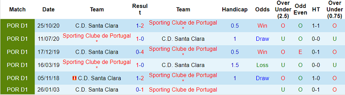 Sporting Lisbon là đội có tỷ lệ thắng kèo cao nhất giải VĐQG Bồ Đào Nha mùa này: 71.43%. Trong khi đó, tỷ lệ thắng kèo của Santa Clara tại Liga NOS 2020/21 chỉ ở mức 47.62%. Sporting Lisbon dĩ nhiên vẫn là kênh đầu tư đáng tin cậy hơn.