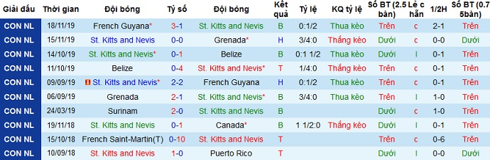 Ở 5 trận đấu gần nhất St Kitts & Nevis cũng chỉ có được 1 trận thắng, 2 trận hòa và để thua 2 trận trong các trận đấu của Concacaf Nation League. Trên sân nhà thành tích của đội bóng tốt hơn đôi chút với 2 trận thắng, 2 trận hòa và 1 trận thua sau 5 trận gần nhất tại đây.
