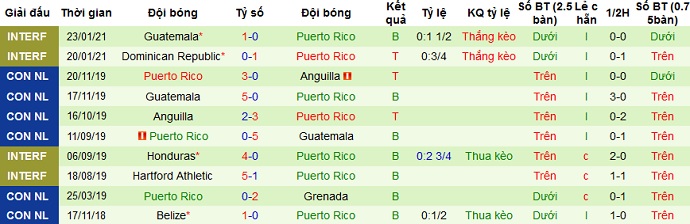 Trái lại Puerto Rico mới đây cũng có được 2 trận giao hữu hồi tháng 1 năm nay nhưng cũng chỉ có được 1 trận thắng và 1 trận thua. Ở 5 trận đấu gần đây đội bóng cũng có được 3 trận thắng và để thua 2 trận. Thành tích sân khách của Puerto Rico có phần tồi hơn khi chỉ thắng 2 và để thua 3.