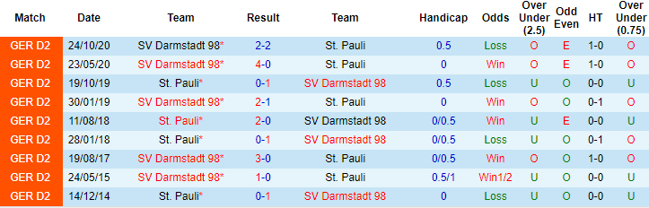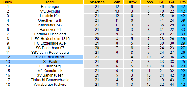 St. Pauli và Darmstadt cùng có được 25 điểm sau 21 vòng đấu tại giải hạng 2 Đức mùa này. Tuy nhiên, Darmstadt tạm xếp trên đối thủ 1 bậc nhờ chỉ số phụ tốt hơn. Theo đó, Darmstadt đang xếp ở vị trí thứ 12, St. Pauli xếp thứ 13 tại Bundesliga 2.