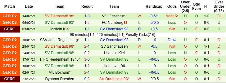 + Thống kê 10 trận gần nhất của Darmstadt
