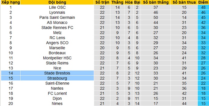 Đối thủ của Strasbourg ở trận đấu tới Brest đang đứng ngay trên ở vị trí thứ 14 với 26 điểm cũng sau 22 vòng đấu. Tuy nhiên đây không phải là điều quá bất ngờ với họ bởi trong mùa giải trước Brest cũng kết thúc ở đúng vị trí thứ 14.
