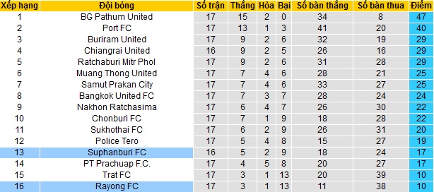 Trong khi đó Rayong đang là tân binh của giải đấu khi được thăng hạng từ mùa này, thế nhưng thành tích của họ còn tệ hơn khi hiện đội bóng chỉ đang đứng bét bảng xếp hạng, mới chỉ có được 10 điểm cũng sau 17 vòng đấu. Hiện Rayong cũng đang có cùng điểm số với đội áp chót nhưng kém về hiệu số bàn thắng và đang thi đấu ít hơn 1 trận.