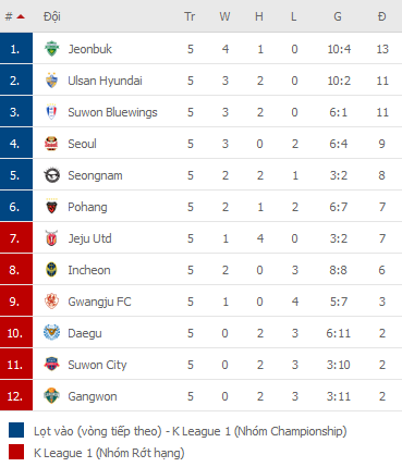 BẢNG XẾP HẠNG VĐQG Hàn Quốc