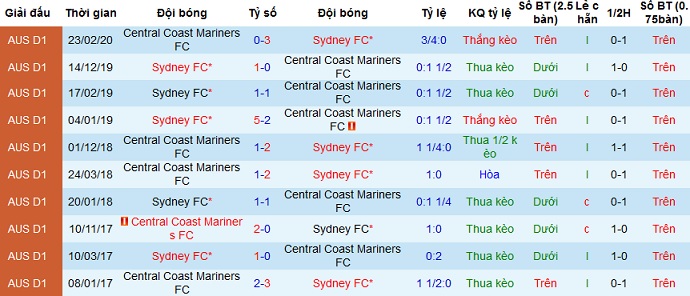 Tỷ lệ kèo Sydney FC vs Central Coast Mariners