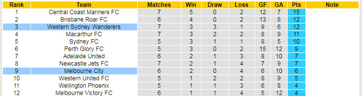 Hiện tại, đội quân của HLV C. Robinson đứng ở vị trí thứ 3 trên BXH và chỉ kém đội đầu bảng khoảng cách điểm số của 1 trận thắng. Chiều nay, họ có trận đấu tiếp đón Melbourne City trên sân nhà và đây sẽ là cơ hội tốt để Sydney Wanderers san bằng khoảng cách với đội đầu bảng.