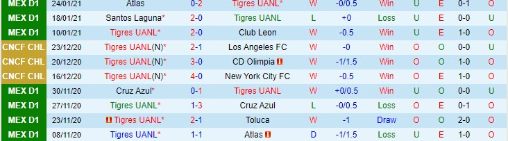 + Thống kê 10 trận gần nhất của Tigres UANL