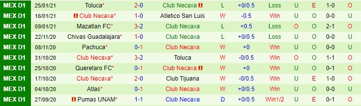 + Thống kê 10 trận gần nhất của Club Necaxa