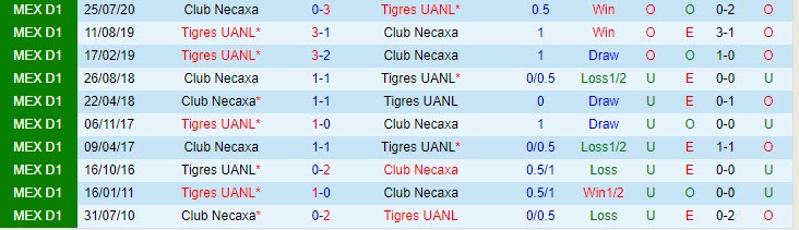 Phong độ và thống kê đối đầu Tigres UANL - Club Necaxa gần đây: