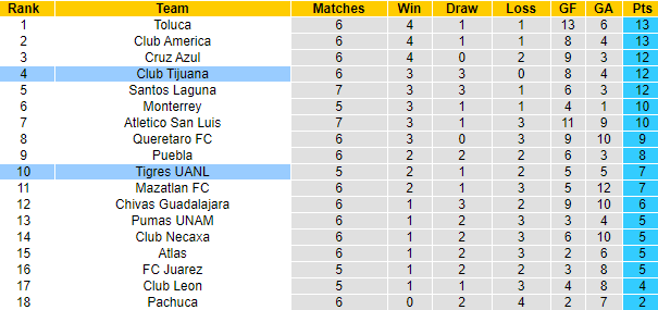 Tigres UANL đang xếp thứ 4 trên bảng xếp hạng giải VĐQG Mexcio với 12 điểm. Trong khi đó Club Tijuana mới giành được 7 điểm ở mùa giải này, xếp ở vị trí thứ 10. Vì vậy trận đối đầu sắp tới, Club Tijuana chấp -1 theo kèo châu Á là hoàn toàn dễ hiểu.