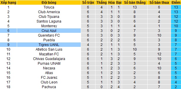 Bảng xếp hạng giải VĐQG Mexico vòng 6