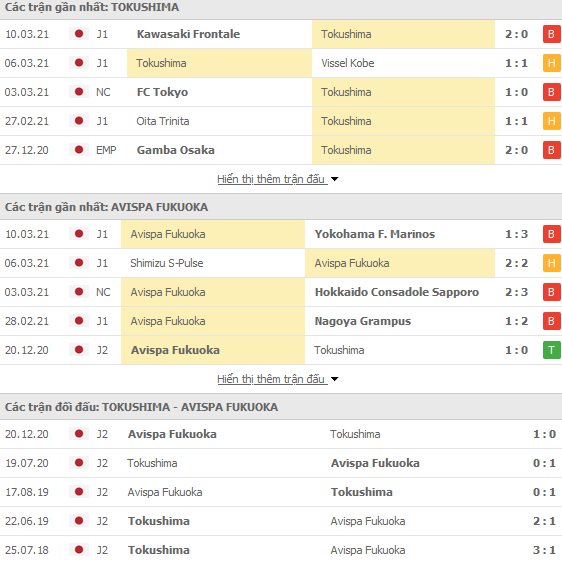 Phong độ và thống kê đối đầu gần đây Tokushima Vortis vs Avispa Fukuoka: