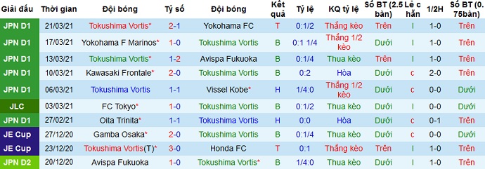 Trong cả 3 lần gặp nhau gần nhất khi Tokushima Vortis được thi đấu trên sân nhà họ đều giành chiến thắng. Bởi vậy với kinh nghiệm trước đối thủ cũng như phong độ sân nhà cũng đang khá tốt của Tokushima Vortis, chọn cửa trên ở trận đấu này là hợp lý.