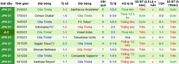 Trong khi đó Oita Trinita cũng chỉ có được 1 trận thắng, 1 trận hòa và để thua 3 trận sau 5 trận gần nhất. Thế nhưng thành tích sân khách của đội bóng lại khá tốt khi thắng 2, hòa 2 và để thua 1 trong 5 trận du đấu gần đây.