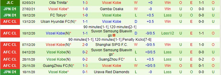 + Thống kê 10 trận gần nhất của Vissel Kobe