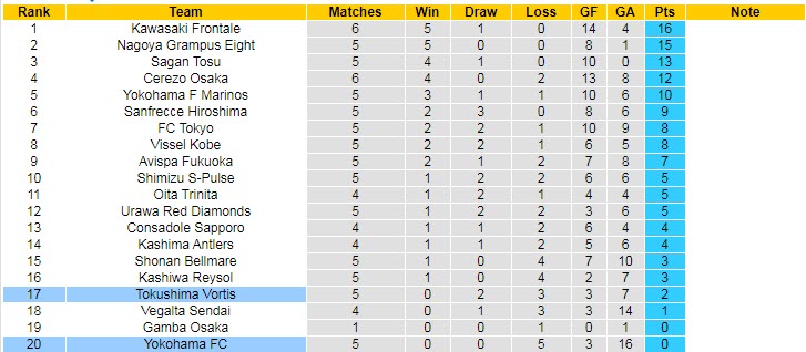 Theo đó, Tokushima Vortis đã để thua liên tiếp 3 lượt trận mới đây. Lúc này, Tokushima Vortis chỉ đứng ở vị trí thứ 17/20 đội tham dự giải VĐQG Nhật Bản khi có được đúng 2 điểm sau 5 lượt trận.
