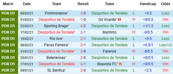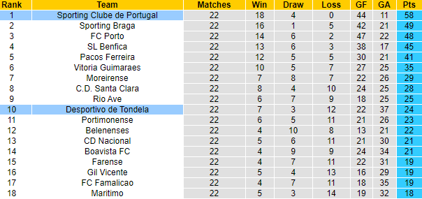 Giữa đôi bên không chỉ có sự khác biệt về lịch sử mà thực tại cũng chênh lệch đáng kể. Tondela dù đang ở khu vực giữa BXH (thứ 10), nhưng thực tế họ vẫn phải chiến đấu để trụ hạng. Khoảng cách về điểm số giữa Tondela với vị trí cầm đèn đỏ gần nhất chỉ là 5 điểm, con số không phải là không thể san lấp.