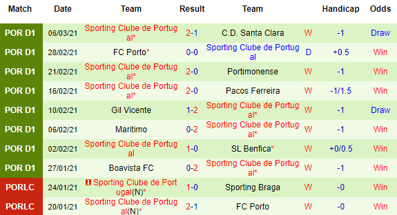 + Thống kê 10 trận gần nhất của Sporting Lisbon