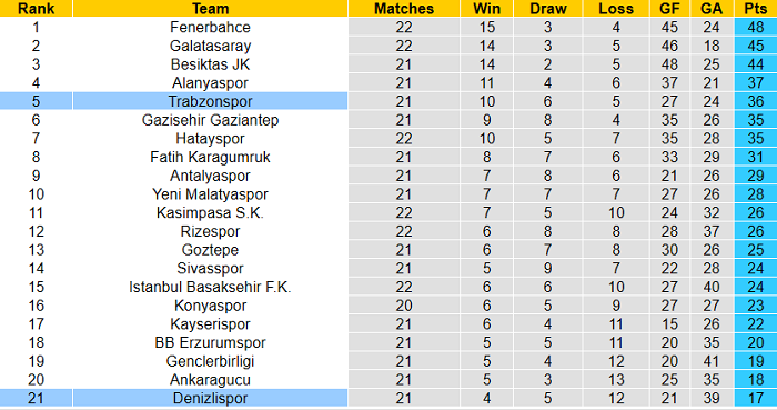 Đơn giản, đối thủ tiếp theo của họ là Trabzonspor và Denizlispor phải thi đấu trên sân khách. Thi đấu trên sân khách quả là ‘cực hình’ với Denizlispor bởi họ không thắng tới 17/19 trận sân khách gần đây thuộc khuôn khổ giải VĐQG Thổ Nhĩ Kỳ.