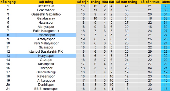 Bảng xếp hạng giải VĐQG Thổ Nhĩ Kỳ trước vòng 19