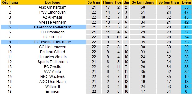 Trong khi đó mùa này Feyenoord mùa này cũng thi đấu không tốt và đã tụt xuống vị trí thứ 5 trên bảng xếp hạng. Với 41 điểm có được sau 21 vòng đấu, Feyenoord cũng chỉ đang kém đội thứ ba AZ Alkmaar 2 điểm nhưng đang thi đấu ít hơn 1 trận.